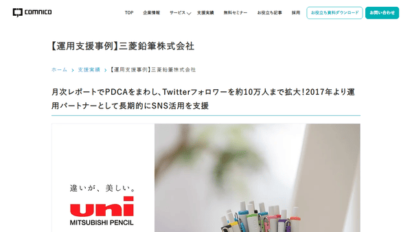 コムニコは、SNS運用におけるマニュアル作成や運用体制の構築支援からスタートし、その後も月次レポートの作成や投稿コンテンツの企画を通じて、三菱鉛筆のTwitterアカウント運用を継続的にサポート。これによりPDCAサイクルを効果的に回し、フォロワー数を約10万人まで拡大しました。SNSを活用した商品認知度向上だけでなく、フォロワーとの交流を通じてブランドイメージの強化にも成功しました。