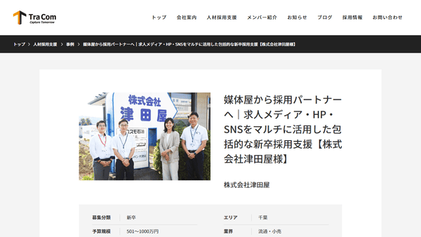 株式会社津田屋は、1943年創業の企業で、千葉県と神奈川県を中心にカーライフサポート事業を展開しています。同社は、新卒採用活動において、少子化やコロナ禍による採用手法の変化などの課題に直面していました。トラコムは、リクナビでの新卒採用支援に加え、採用特設LPの作成やブログの運用、InstagramなどのSNS活用を提案し、企業の魅力を多角的に発信する戦略を構築しました。さらに、ターゲット別のインターン企画や説明会動画の制作など、包括的な支援を実施しました。これらの取り組みにより、前年と比較して2倍以上の採用数を達成し、採用活動の効率化と成果向上に貢献しました。